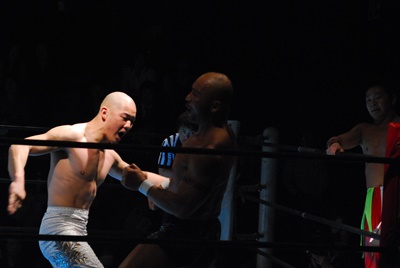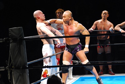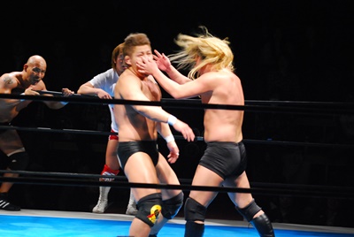 邪道バックドロップ(左写真)、トマトがカット。邪道は外道にタッチ。外道首投げから顔面にトラースキック、これもトマトがカット。邪道にタッチ。10分経過。