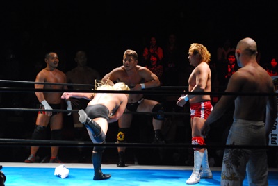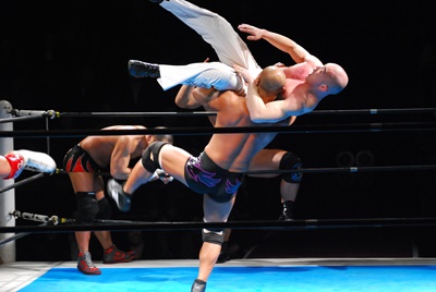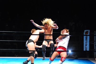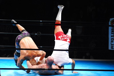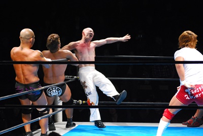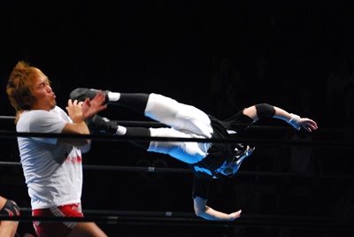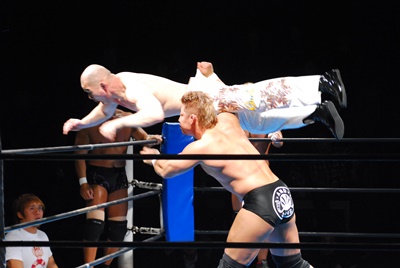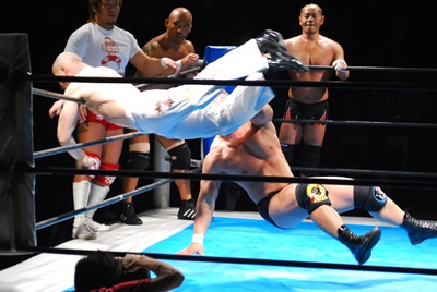 邪道と内藤がダブルのブレーンバスター狙うが浪口は2人をDDTに切り返す(右写真)、マリーンズにタッチ。