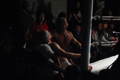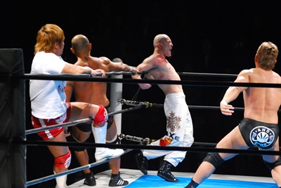 裕二郎は浪口を場外に出す。場外で邪道が逆水平連打(右写真)、その間にコーナーバッグを外す。