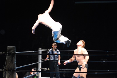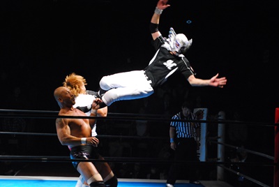 邪道ターンバックルにぶつけ、対角線コーナーに振って突っ込む、マリーンズはサルト・モルタルでかわしてウラカン・ホイップ(左写真)、浪口にタッチ。