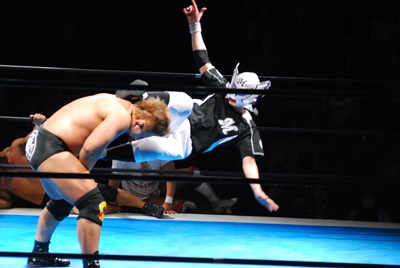 邪道と内藤の2人を翻弄した末に内藤にドロップキック(右写真)。