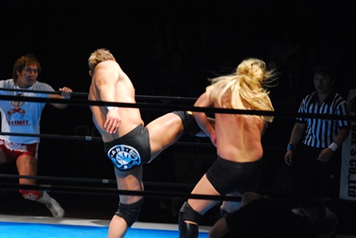 邪道ストンピング、エプロンに出た浪口に逆水平5連発(右写真)、浪口真っ逆さまに場外転落。カウント19でリングに戻る。