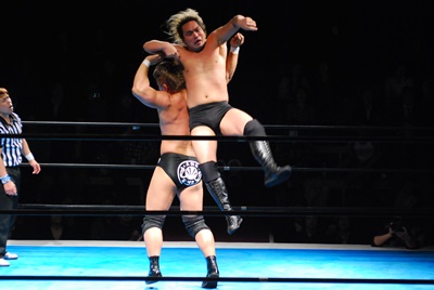 大家ガットショット、ロープに飛ぶ、内藤が入って2人でリフトアップ(左写真)
