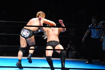 裕二郎も逆水平(右写真)、ヘッドロック。