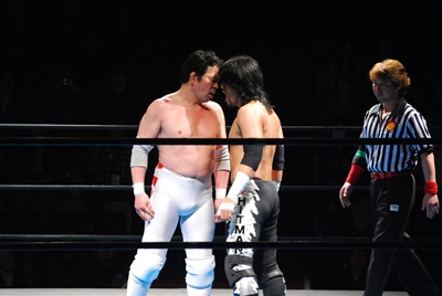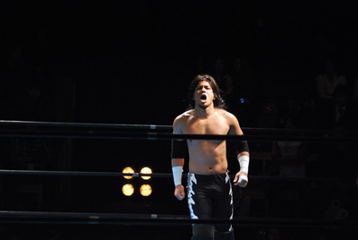 いよいよ決勝、勝ったらBest of Super Jr.出場決定。佐々木大輔入場(右写真)。