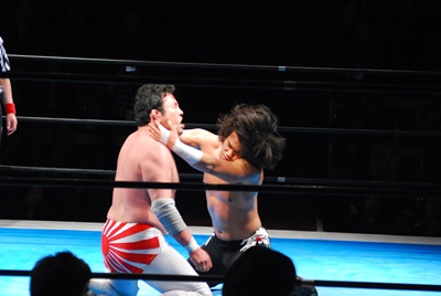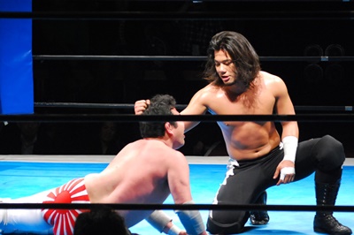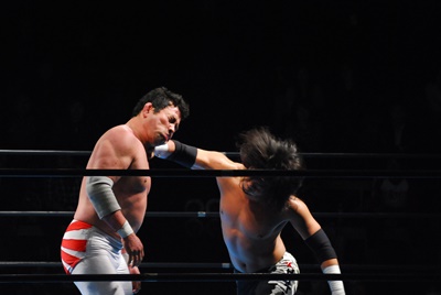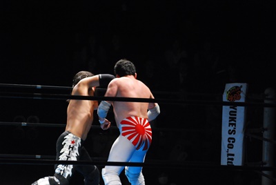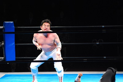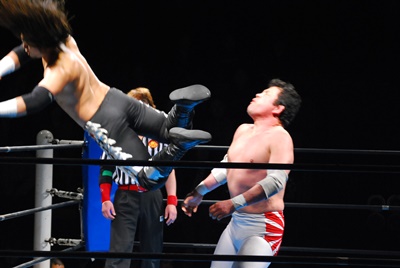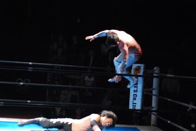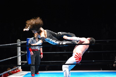 佐々木コーナーに上ってミサイルキック(左写真)、カウント2。