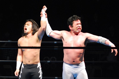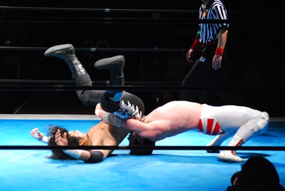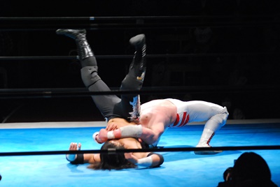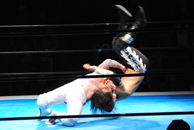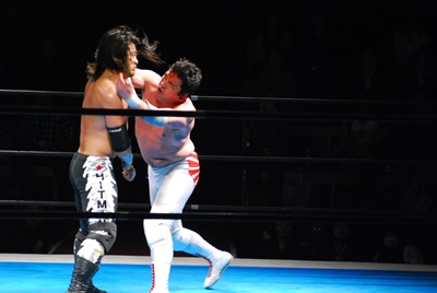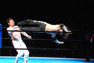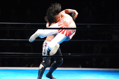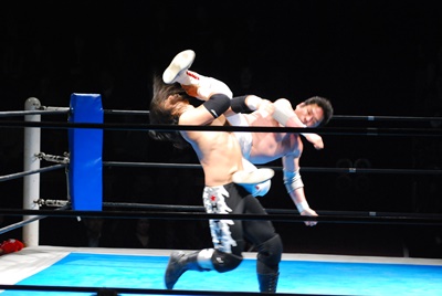 菊地追いかけてコーナーに上りスパイダー式フロントスープレックス(左写真)。
