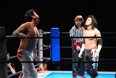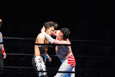 佐々木ニーリフト、ドロップキック、パンチ、コーナーに振って串刺しラリアット(右写真)、カウント2。