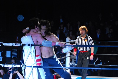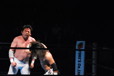 佐々木菊地をリングに戻すとまたターンバックルに顔面をぶつける。菊地佐々木を睨みつける(左写真)。