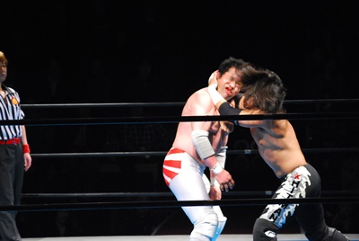 佐々木ヘッドバット連打(左写真)、菊地の額から血がにじむ。