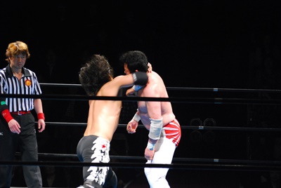 佐々木エルボー連打(右写真)、菊地もエルボー返す。