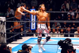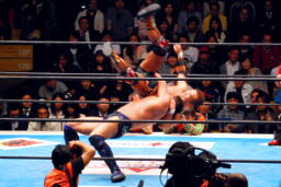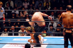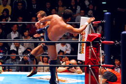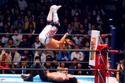 コーナーに上ってサマーソルトドロップ(左写真)、カウント2。