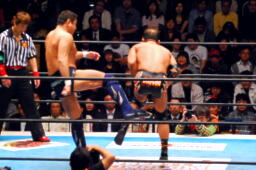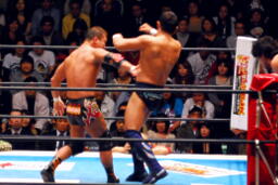 中邑後ろ回し蹴り、棚橋かわしてエルボー(右写真)、張り手の打ち合い。