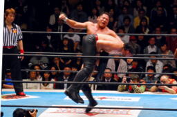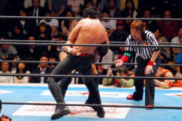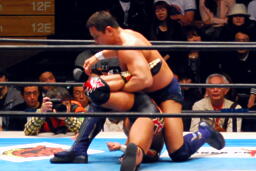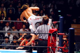 田中は永田、棚橋にラリアット連発(右写真)、場外戦に。田中は永田、中邑は棚橋をフェンスにぶつける。さらに田中は竹刀を永田の喉に押し付けチョーク攻撃。田中が永田をリングに戻す。