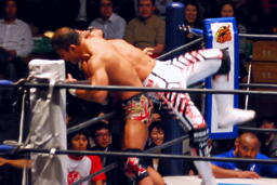 棚橋はコーナーの中邑目掛けクロスボディ(右写真)、中邑かわして棚橋はコーナーに乗り上げる、中邑そこにヒザ蹴り、カウント2。