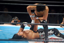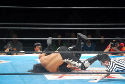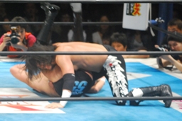 佐々木首固め(左写真)、カウント2。もう一回首固め、これもカウント2。