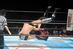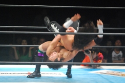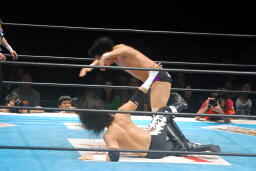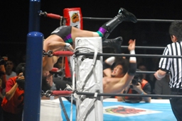 コーナーに上って再度のクロスボディ(右写真)、今度は成功、カウント2。