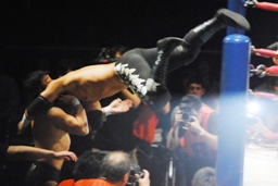 田口をトップロープに引っ掛けて顔面にドロップキック(右写真)、カウント2。