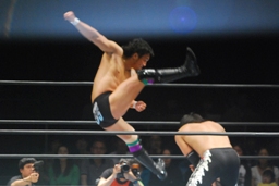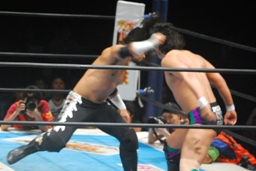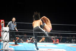 佐々木クロスボディ、田口は下からドロップキックで迎撃(右写真)、カバー、カウント2。