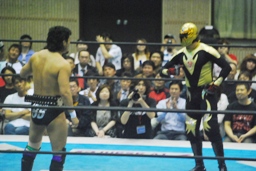 CMLLウェルター級のベルトを腰に巻いてきた田口に前王者のドラダが挑発(右写真)。