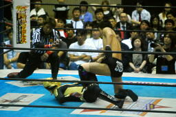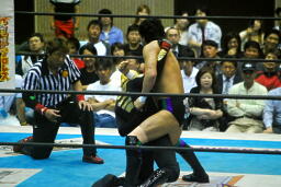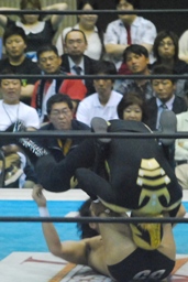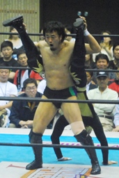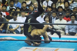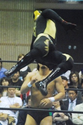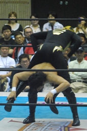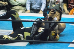 ロックアップ、田口バック取る、ドラダヘッドロック。田口足をすくってステップオーバートーホールド(左写真)。