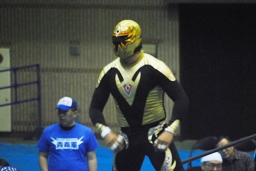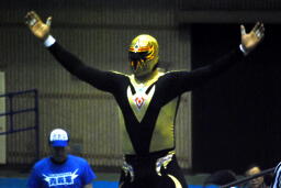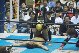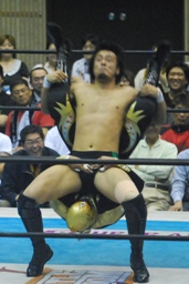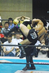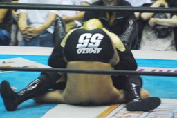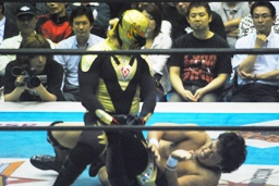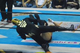 ドラダがブレーンバスター狙うが田口ブロックして逆に投げる(右写真)、3連発に。田口ターンバックルにぶつける。5分経過。