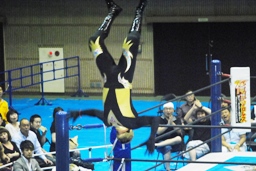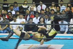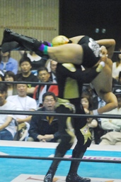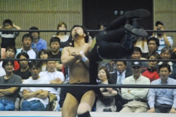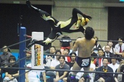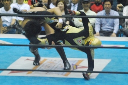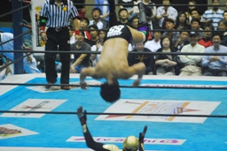 ドラダが田口をリングに戻す。ドラダも戻ろうとすると田口はドロップキック(右写真)、ドラダ場外転落。