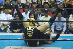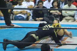 弓矢固め(左写真)、田口身を翻してカバー、カウント1。