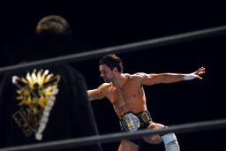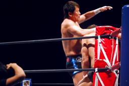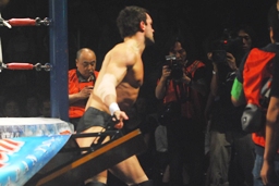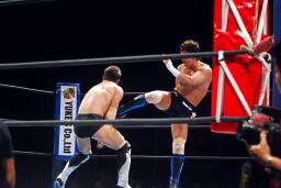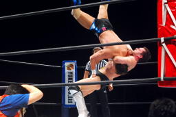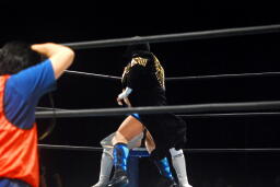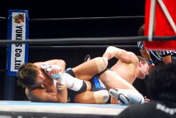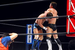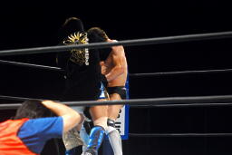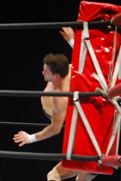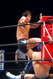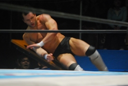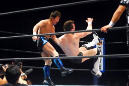 金本ボディスラムからムーンサルト狙って後ろ向きにコーナーに上る、デヴィット起き上がって金本の体勢を崩すと背後からジャンピングハイキック(左写真)。5分経過。