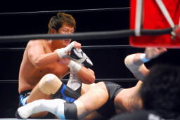 金本再び顔面ウォッシュからエルボースマッシュ連打(右写真)。