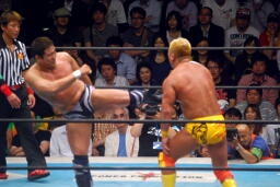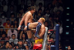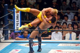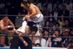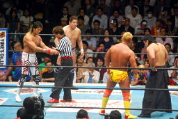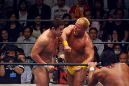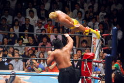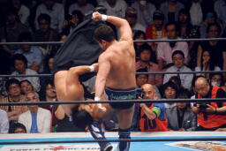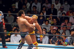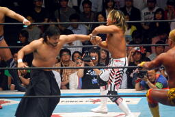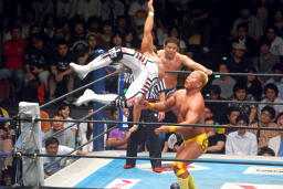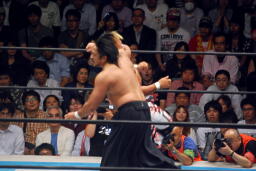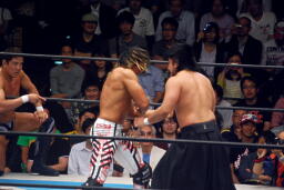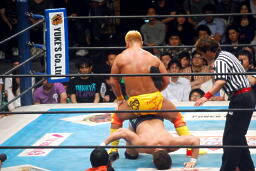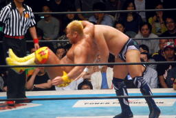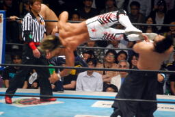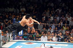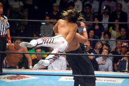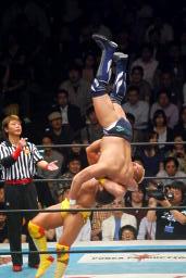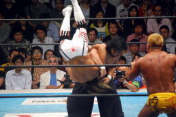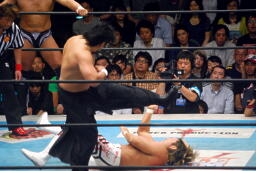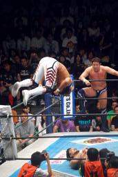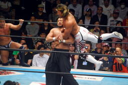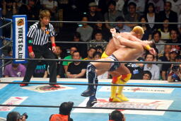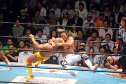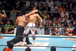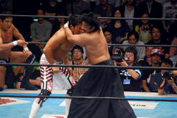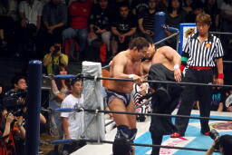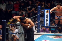棚橋ヒップトス、後藤ブロックして逆にヒップトス(左写真)、サッカーボールキック、棚橋場外に。両軍タッチ。ロックアップから腕の取り合い。