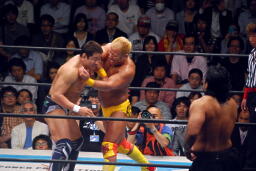 本間ロープに飛ぶ、永田低空ドロップキック。永田ブレーンバスター、これは本間がブロックして逆に投げる(左写真)。本間は後藤にタッチ。5分経過。