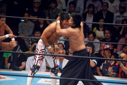 ロックアップ、後藤バック取る、棚橋切り返す、後藤腕取って切り返す、棚橋切り返す(左写真)。逆水平からショルダーブロックの打ち合い。