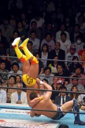 ボディスラムからコーナーに上ってサマーソルトドロップ(右写真)、カウント2。