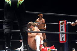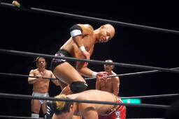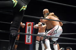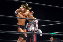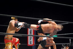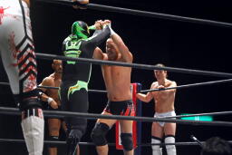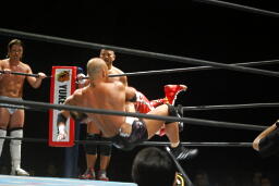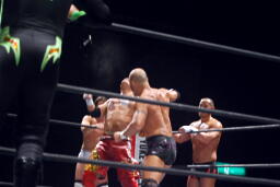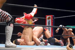 手四つから力比べ(右写真)、外道が押し込むがドラダはジャンプしてレッグホイップ、外道場外に。邪道と棚橋がリングイン。