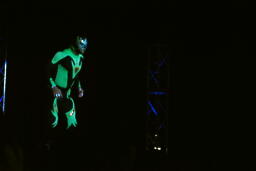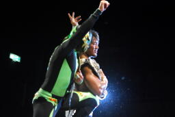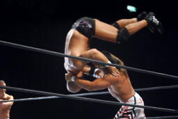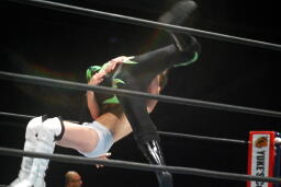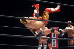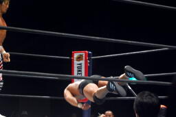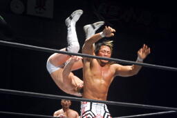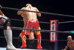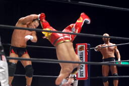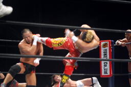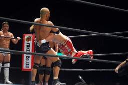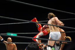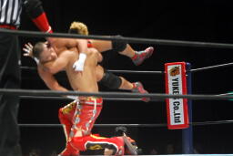 棚橋コーナーに振る、邪道はフレアーフリップでエプロンに着地、コーナーに上るが棚橋はデッドリードライヴ(右写真)。邪道はブライアンにタッチ。ブライアンローキック連打、足をすくってレッグロック。5分経過。