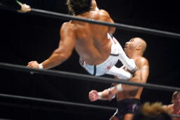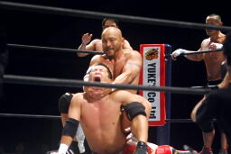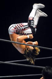 KUSHIDAダイビングチョップ(右写真)、ブライアンをロープに振る、外道がその背中にタッチ。
