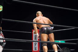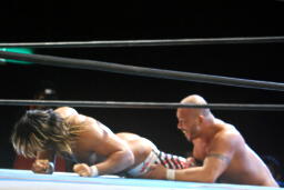 また時間差ダウン(右写真)。棚橋はドラだにタッチ。邪道もブライアンにタッチ。