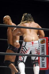ロックアップ、棚橋がロープに押し込む、ブレーク。再度ロックアップ、邪道ヘッドロック(左写真)、棚橋ロープに振ってショルダーブロックの打ち合い、棚橋クロスボディ。