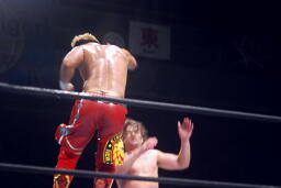 棚橋ボディスラム、セカンドコーナーに上ってサマーソルトドロップ(右写真)、カウント2。