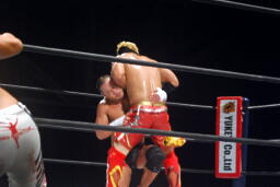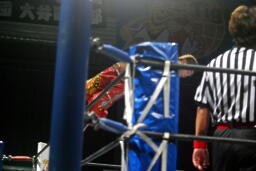 バックドロップ(左写真)、カウント2。ストンピング。10分経過。
