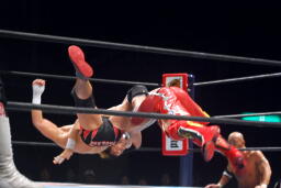 トップロープを飛び越えてウラカン・ラナ(左写真)。これは素晴らしい。ドラダミサイルキック、カウント2。KUSHIDAにタッチ。