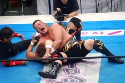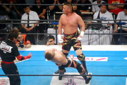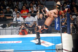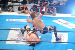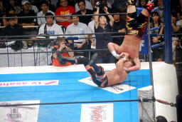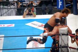 コーナーに上ってダイビングエルボードロップ(左写真)、カウント2。