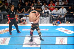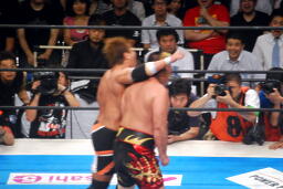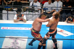 小島ヘッドロック、天山ロープに振る、ショルダーブロックの打ち合い(左写真)。