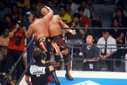 天山がムーンサルト狙ってコーナーに上る、小島起き上がる(左写真)