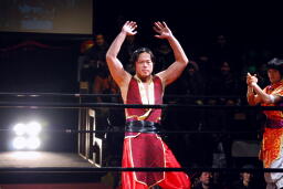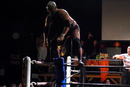 Achooooo!ランジェイをコーナーに振る、ランジェイ切り返すがAchooooo!にエプロンに出てハイキック、コーナーに上ってミサイルキック(右写真)、ランジェイはジェットにタッチ。