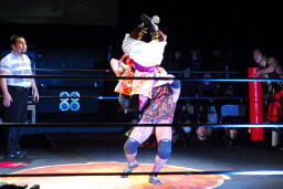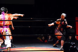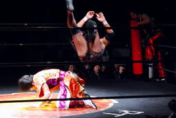 周瑜がトラースキックからアサイDDT(左写真)、ジェットがカット。Achooooo!がジェットをドロップキックで場外に落としトペ・スイシーダ。