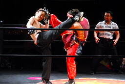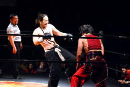 ジェットとAchooooo!がリングイン(左写真)、ローキックの打ち合い。
