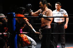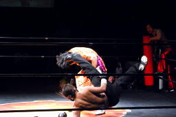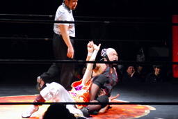 周瑜コーナーに振る、ジェット切り返して突っ込むが周瑜は腕をキャッチしてぶら下がり十字固め(右写真)、レフェリーがブレーク。