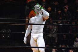 するとダビデ像がリング中央に進んでポーズ(右写真)。そういえばダビデ像ってこんなポーズだった。